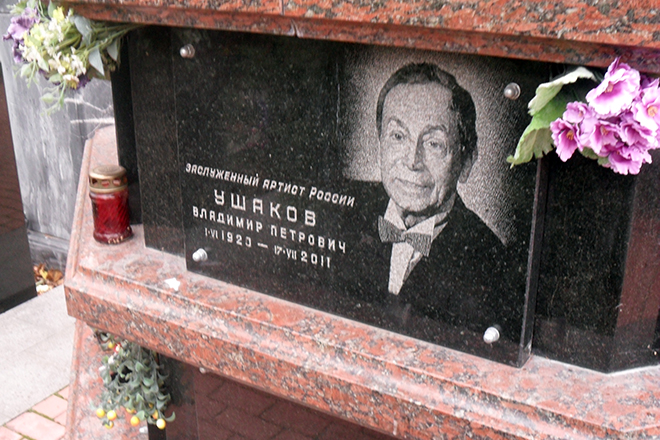 Приехавшая «скорая» повезла Ушакова не в ту больницу, по пути Владимир Петрович скончался. Тело артиста кремировали, и прах захоронили в колумбарии Ваганьковского кладбища.