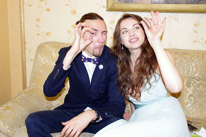 До брака они продолжительное время встречались. Пара предпочла просто расписаться и не играть пышную свадьбу. В день свадьбы на Ксении было открытое светло-голубое платье и белая фата. Молодой человек отказался от классического костюма, а надел современный синий пиджак и галстук-бабочку с лисичками.