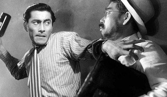 Кадр из фильма Акиры Куросавы «Пьяный ангел» Однако первым «по-настоящему своим» фильмом Куросава называл социальную драму «Пьяный ангел» (1948), где кроме того произошло рождение его многолетнего союза с артистом Тосиро Мифунэ, сумевшим создать идеальный образ самурая – с благородными чертами лица, цепким взглядом, хорошей мускулатурой, прямой осанкой, суровым видом. С его участием Куросава впоследствии снял 16 лент. Распался же их тандем в 1965 году после выхода картины «Красная борода» и разорения его кинокомпании. Мировая слава мастера режиссуры и его победы на престижных фестивалях начались в выходом ленты «Расемон», поставленной им по рассказав японского классика Акутагавы Рюноскэ «В чаще» и «Ворота Расемон». Работа, наполненная глубоким смыслом, представила четыре версии одного преступления, рассказанные вдовой самурая, самим самураем, свидетелями и убийцей. В 1951 году эта киноработа была удостоена гран-при Венецианского кинофестиваля, затем завоевала «Оскар».