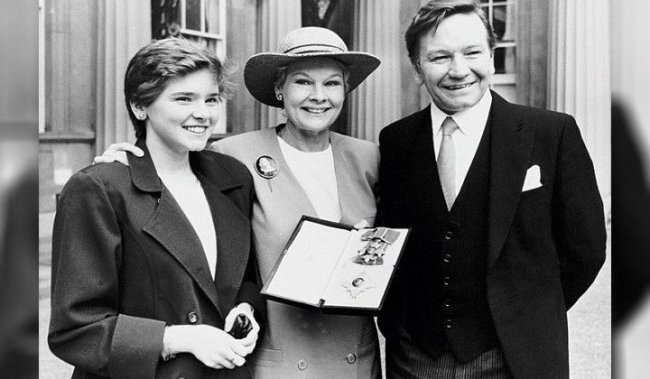 Юная Джуди с отцом, братом и его женой А вот старший брат Джеффри рано определился с будущей профессией, записался в театральный кружок и заразил своей страстью к актерству Питера и Джуди. Со временем средний брат откололся от их компании и серьезно увлекся медициной, а вот младшенькая всерьез «заболела» театром, забросила художественную студию и, окончив колледж, вслед за братом поступила в лондонскую Школу дикции и драмы.