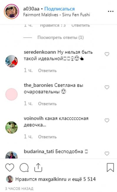 Модель не забывает о своих подписчиках даже на отдыхе. В Instagram экс-супруга режиссера Федора Бондарчук старается делиться свежими кадрами с Мальдив. Светлана Бондарчук (Фото: Globallookpress.com) Как уже писал сайт Teleprogramma.pro, только за последние три месяца на Мальдивах успела побывать не только балерина Анастасия Волочкова, но и другие знаменитости. В их числе: выпускница «Фабрики звезд» Полина Гагарина с мужем Дмитрием Исхаковым, музыкальный продюсер Яна Рудковская, которая отдыхала на курорте в компании шестилетнего сына Саши ( Гном Гномыч. — Прим. ред.) и мужа Евгения Плющенко. Также на острове зимние каникулы проводила ведущая «Дома-2» Ольга Бузова. 48-летняя Заворотнюк демонстрирует роскошную фигуру после рождения дочери Молодая мама появилась на презентации салона, показав, что находится в отличной форме после рождения третьего ребенка. Теперь же своими пляжными снимками с Мальдив поделилась 50-летняя Светлана Бондарчук. Модель в Instagram опубликовала свежие кадры с недавней фотосъемки. Перед объективами камер экс-супруга режиссера Федора Бондарчука предстала в белом закрытом купальнике с полупрозрачными вставками. «День четвертый», — написала в микроблоге Светлана. Примечательно, что снимки модели всего за три часа набрали порядка пяти с половиной тысяч отметок «нравится». «Шикарная фигура», «Идеальная», «Это все благодаря йоге», «Нельзя так хорошо выглядеть! Давлюсь уже от белой зависти! Хочу к морю!», «Света, вы красавица», «Ну, нельзя быть такой идеальной», — такие комментарии появились под фото Светланы Бондарчук. Поклонники оценили фигуру Светланы Бондарчук (Фото: Instagram.com/a030aa) Напомним, что после того, как Светлана и ее экс-супруг Федор Бондарчук подтвердили информацию о своем разрыве, модель все чаще стали видеть в компании галериста Сергея Табунова, а сам режиссер перестал скрывать отношения с 30-летней Паулиной Андреевой.