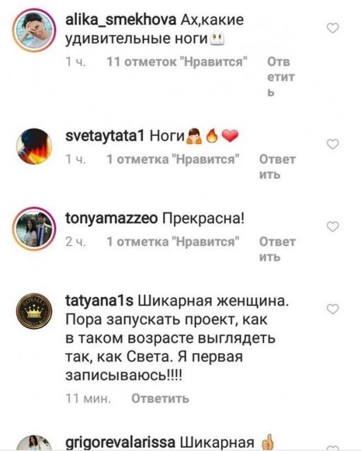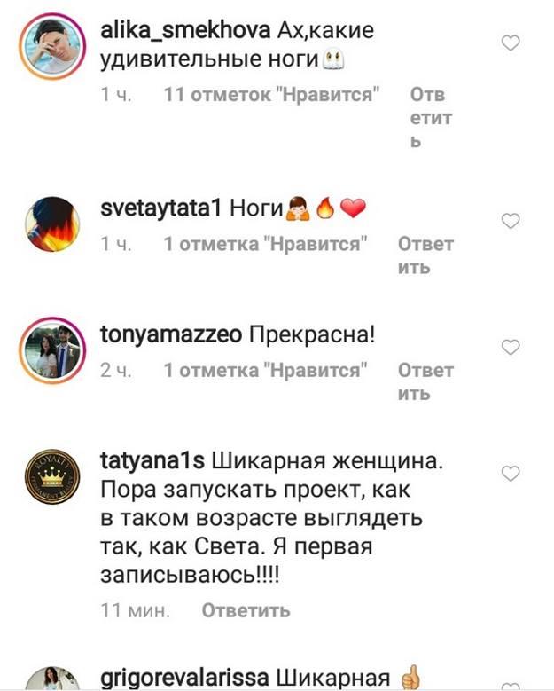 «Ноги!!», «Прекрасна», «Шикарная женщина! Пора запускать проект, как в таком возрасте выглядеть, как Света… Я первая записываюсь» — такие комментарии появились под фото модели в ее микроблоге.