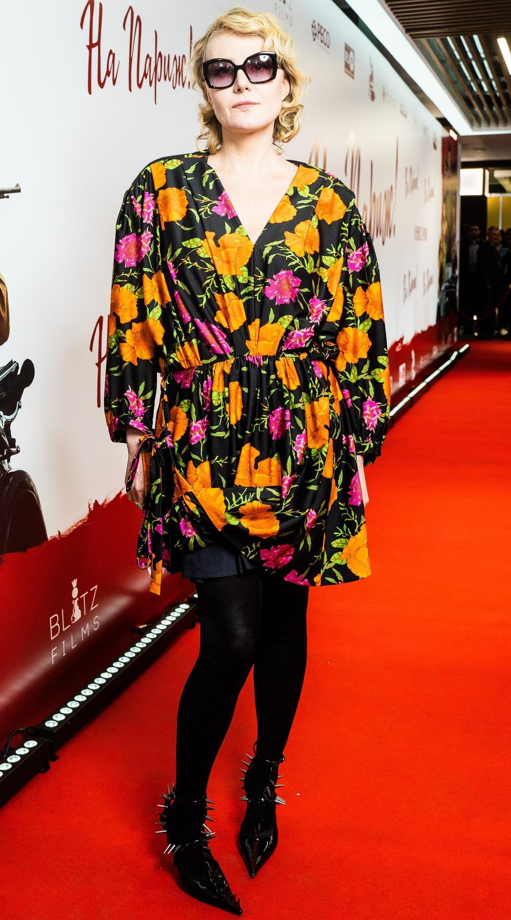 Также в киноленте «На Париж!» снялась Рената Литвинова. Время не властно над ней – 52-летняя актриса поражает поклонников немеркнущей красотой и стройной фигурой. На премьеру фильма Литвинова пришла в платье с цветочным принтом, которое является трендом наступающего летнего сезона. Не только платья в горох будут носить этим летом! Актриса дополнила образ необычными туфлями с шипами и решила обойтись без макияжа. Платье в цветочек яркое само по себе.
