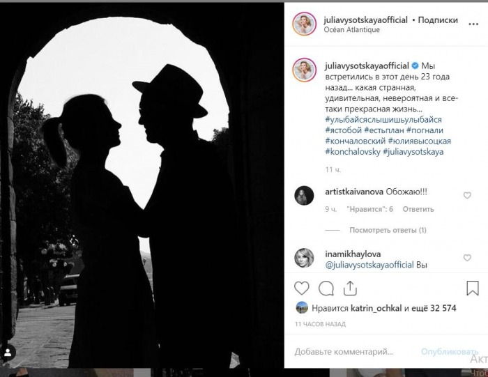 Пара в браке более 20 лет. Для известного режиссера этот союз по счету стал пятым. Юлия Высоцкая и Андрей Кончаловский Фото: globallookpress.com Эти выходные дни оказались богаты на важные даты. Шесть лет назад 8 июня поженились телеведущая Лера Кудрявцева и хоккеист Игорь Макаров. Этот же день важен для другой звездной пары – режиссера Андрея Кончаловского и актрисы Юлии Высоцкой. Они поженились в 1998-м, а двумя годами ранее познакомились. «Мы встретились в этот день 23 года назад… какая странная, удивительная, невероятная и все-таки прекрасная жизнь…» — написала в своем блоге Высоцкая. СКРИНШОТ: Кончаловский старше своей супруги на 36 лет. До этого он был женат четыре раза. Самый первый брак продлился всего пару лет. Напомним, в начале 2019 года Кончаловский и Высоцкая спустя столько времени после свадьбы решили заключить еще один союз – они обвенчались. Эта новость стала сюрпризом и для поклонников, и для ближайшего окружения супругов. До последнего свое намерение они держали в тайне. Кстати, именно в тот момент в очередной раз пошли слухи, что отношения между Юлией и Андреем разладились. Но со временем эти разговоры прекратились. Высоцкая с 81-летним мужем поучаствовала в фотосессии для журнала Tatler В своем микроблоге Юлия Высоцкая опубликовала черно-белый снимок, который был сделан во время недавней фотосъемки. Близкие пары полагают, что супруги стали отдаляться друг от друга после страшной аварии, в которой пострадала их дочь Мария. ДТП случилось почти шесть лет назад.
