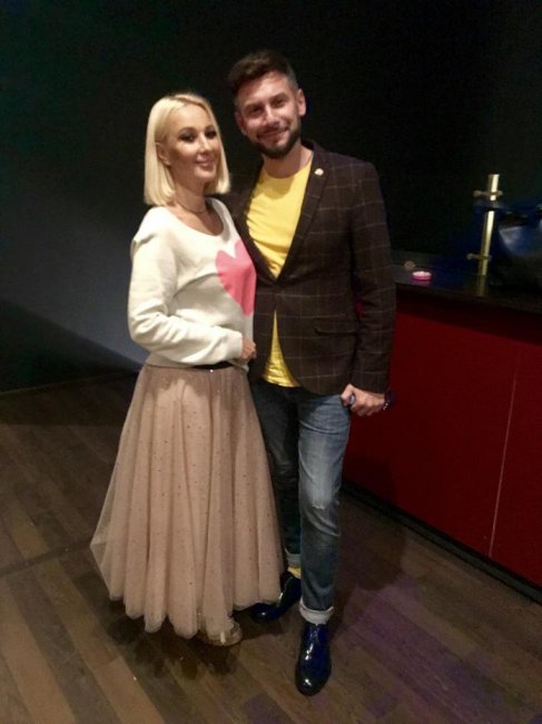 Ведущая программы «Секрет на миллион» позировала перед объективами фотокамер с ви-джеем телеканала «МУЗ-ТВ» Андреем Разыграевым.