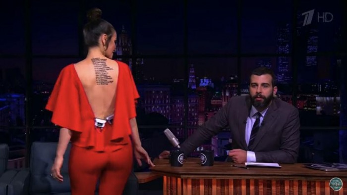 Не прошло и года, как Орейро вновь приехала в столицу. На днях она снялась в передаче «Вечерний Ургант». С ведущим Иваном Ургантом певица уже по свойски обнялась и расцеловала его в щеки. В 41 год артистка обладает стройной фигурой, что и продемонстрировала, облачившись в алый комбинезон, который подчеркнул ее формы. Как и в прошлый раз, Наталия написала на своем теле список городов, в которых даст концерты в ближайшие недели.