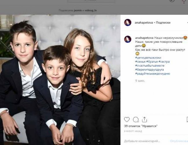 «Наши неразлучники. Наши, такие уже повзрослевшие дети. Как же всё-таки быстро они растут», — заявила Анна Нахапетова. В хештегах она написала: «Радуйтесь каждому дню», «Берегите друг друга», «Счастье быть вместе».