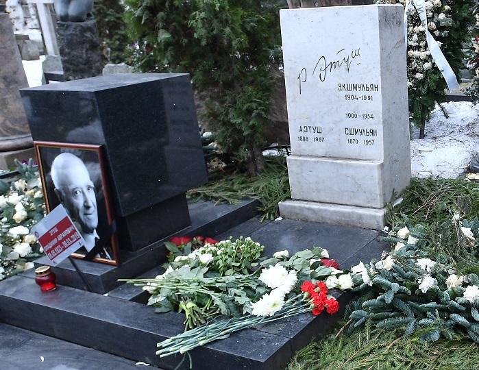 На церемонии открытия мемориала присутствовали супруга актера, его коллеги по театру и режиссеры, у которых снимался народный артист. Иван Макеев/КП В понедельник на Новодевичьем кладбище состоялось открытие памятника Владимиру Этушу. Об этом журналистам сообщил руководитель театра имени Вахтангова, где трудился Этуш, Кирилл Крок. Директор отметил, что отдать дань уважения великому артисту пришли не только родственники в лице супруги Елены, но и многочисленные коллеги — народный артист России Евгений Карельских, заслуженный деятель искусств РФ, режиссер Владимир Иванов, а также артисты Александр Павлов, Любовь Корнева, Екатерина Симонова. РИА Новости отмечают, что памятник был выполнен в соответствии с представлениями самого артиста. Идею воплотил в жизнь художник Максим Обрезков, архитектором стала Елена Копелиович, а за изображение профиля отвечал Сергей Загоровский. Устанавливали же монумент за счет личных средств семьи Этуша. Напомним: народный артист СССР Владимир Этуш ушел из жизни 9 марта на 97 году жизни. После кончины актера родственники приняли решение кремировать мужчину и спрятать урну с его прахом на семейном участке. Кремация проходила на ТРоекуровском кладбище.