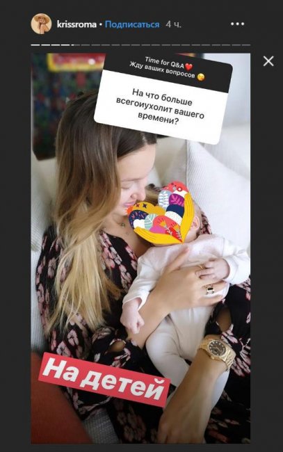 Показала молодая мама и фото младшей дочери. На снимке в «сториз» Кристина сидит с малышкой на руках. Девочка одета в белоснежный комбинезончик, а ее личико на фото скрыто стикером в виде сердечка.
