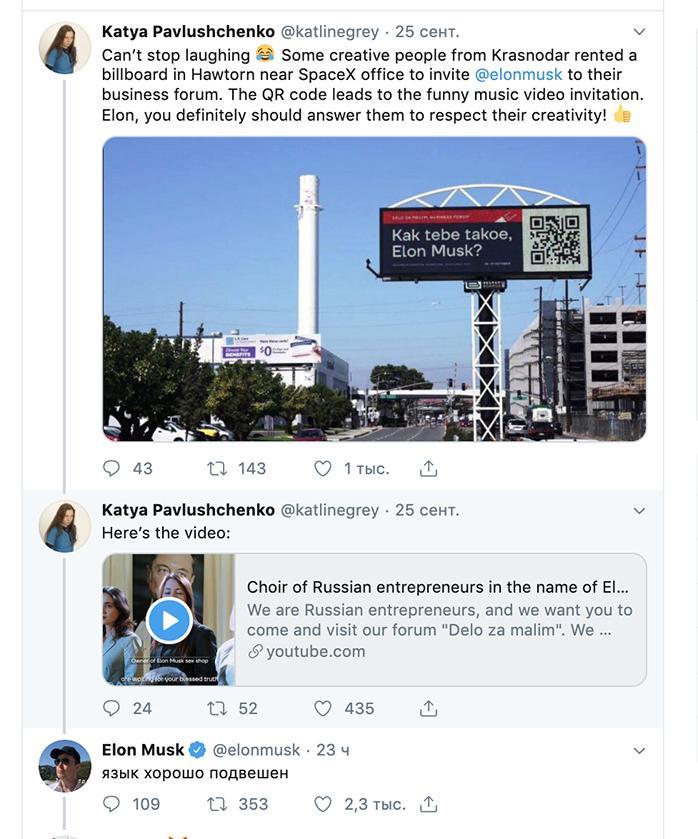 Ан нет! Креатив, с которым краснодарцы подошли к делу, пытаясь «заманить» американского гостя на мероприятие, так его впечатлил, что сперва 48-летний Маск дал понять, что всё понял, а затем ответил согласием. Об этом сообщает издание «Югополис» со ссылкой на руководителя департамента инвестиций и развития малого и среднего предпринимательства Краснодарского края Виталия Воронова.