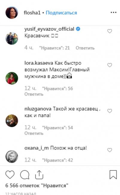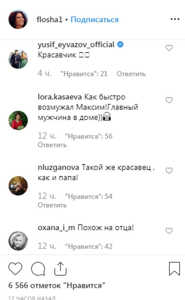 «Как быстро возмужал Максим! Главный мужчина в доме», «Такой же красавец, как и папа!», «Похож на отца!», «Есть папина харизма и мужественность!! Пусть будет счастливым здоровым!!», «Максим такой красивый и мужественный стал! Как повзрослел», «Максим, как ты вырос, за этот год!!! Какой ты — Красавец!!! Гордость родителей!!» – такие комментарии появились под свежим фото Флоранс на ее страничке в микроблоге.
