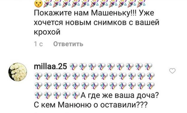 «Покажите нам Машеньку!! Уже хочется новых снимков с вашей крохой!!», «А где же ваша доча? С кем Манюню оставили???», «Готовы отвечать на вопросы: «А где ребенок? Хоть покормили?» Ты же мать!» — прокомментировали фото Леры Кудрявцевой ее подписчики.