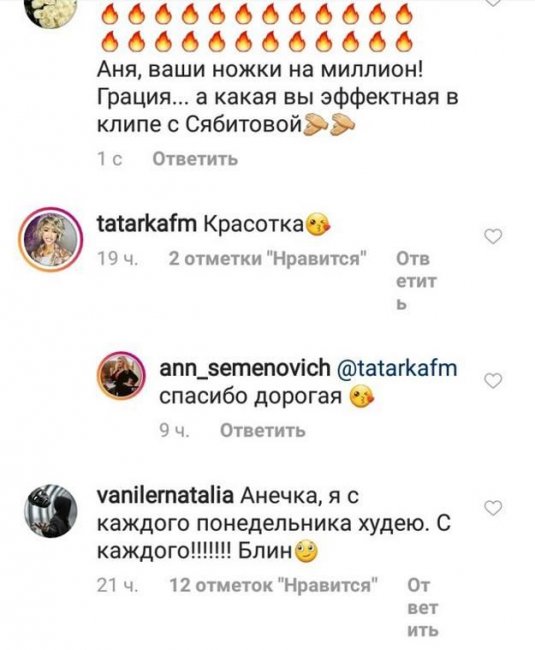 «Аня, ваши ножки на миллион! Грация… а какая вы эффектная в клипе с Сябитовой», «Роковая женщина», «Помада и серьги классные!!!», «Аня! Выглядишь, как всегда, шик», «Анечка, я с каждого понедельника худею. С каждого!!», «Вау, Анна! Так великолепно выглядишь, глаз не оторвать», — такие комментарии появились под фото певицы на ее личной страничке в микроблоге.