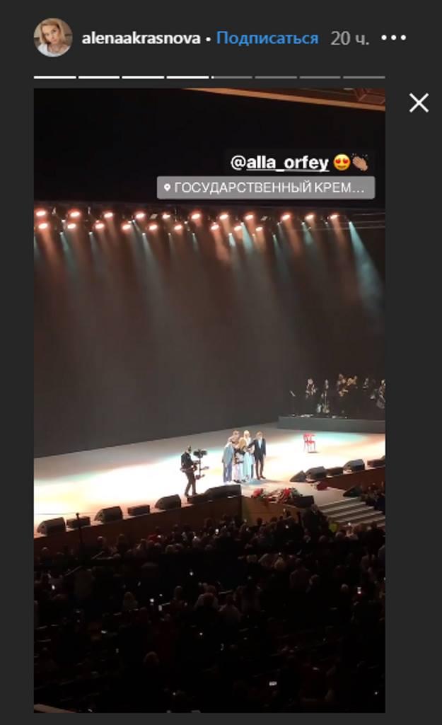 Жена 27-летнего Никиты Преснякова специально для своих поклонников вела трансляцию в Stories. Алена Краснова (Фото: Instagram.com/alenaakrasnova) 70-летняя Алла Пугачева выступила с юбилейным концертом в Кремлевском дворце. Среди приглашенных гостей в зале также находилась и невестка Примадонны — модель Алена Краснова. Избранница старшего внука Аллы Борисовны специально для своих подписчиков вела трансляцию в Stories своего аккаунта в Instagram, выкладывая видеоролики и кадры с мероприятия. Как все было: Волочкова не усидела в зале на концерте Пугачевой Балерина поднялась на сцену к Алле Борисовне на ее юбилейном шоу в Кремле. Алена Краснова не смогла пропустить концерт Аллы Пугачевой (Фото: Instagram.com/alenaakrasnova) На сцену к Алле Пугачевой вышла вся ее семья (Фото: Instagram.com/alenaakrasnova) Девушка запечатлела на камеру момент, когда на сцену к поющей Примадонне вышла ее дочь Кристина Орбакайте со своими детьми — Никитой и Дени. В одном из интервью 20-летний Байсаров признался, что в домашней обстановке они зовут бабушку исключительно по имени — Алла и Аллуся. Игорь Николаев также все записывал на камеру (Фото: Instagram.com/igor_nikolaev_music) На концерте певицы также была замечена и Анастасия Волочкова. Балерина не смогла усидеть в зале и поднялась к Алле Борисовне, продемонстрировав свой традиционный продольный и вертикальный шпагат под песенный номер именинницы. Примечательно, что сама Примадонна назвала артисту балета королевой Instagram. Напомним, что еще до дня рождения Аллы Пугачевой свое 22-летие отпраздновала супруга Никиты Преснякова, которая появилась на свет 8 марта. Певец поздравил возлюбленную с двойным праздником, подарив Алене букет цветов.