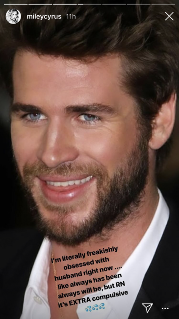 В своем Instagram Ханна Монтана постоянно публикует снимки супруга и пишет о своих чувствах. Недавно она выложила его портрет в сторис, подписав: «Я буквально одержима мужем. Так было всегда и будет всегда, но сейчас это чувство слишком сильно».