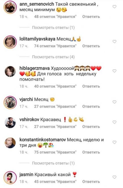 В комментариях под свежей публикаций «золотого голоса России» успела отметиться Лолита Милявская, Жасмин и Анна Семенович, которые одними из первых отреагировали на слова Николая Баскова.