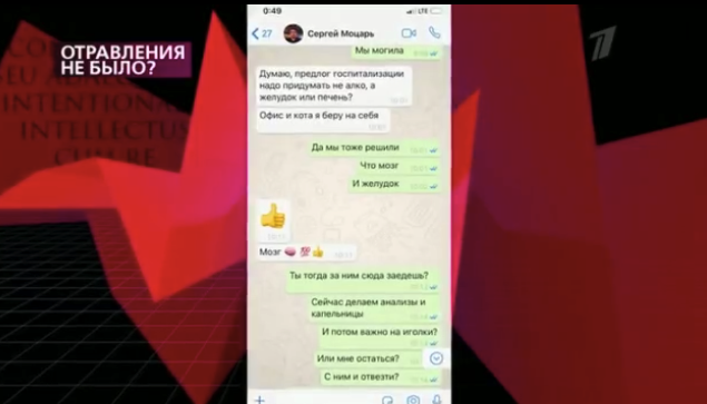 После этого была обнародована переписка помощника Бари Каримовича Сергея Моцаря и лечащего врача. Стороны переписывались в мессенджере за месяц до нашумевшего отравления продюсера средством для прочистки труб. По словам Дмитрия Шепелева, это и стало отправной точкой пиар-акции. «Думаю, предлог госпитализации надо придумать не алко, а желудок или печень? Офис и кота я беру на себя», — пишет Моцарь доктору. Тот отвечает: «Мы тоже решили, что мозг и желудок». После этого гости в студии уже не сомневались, что Алибасов всех обвел вокруг пальца.