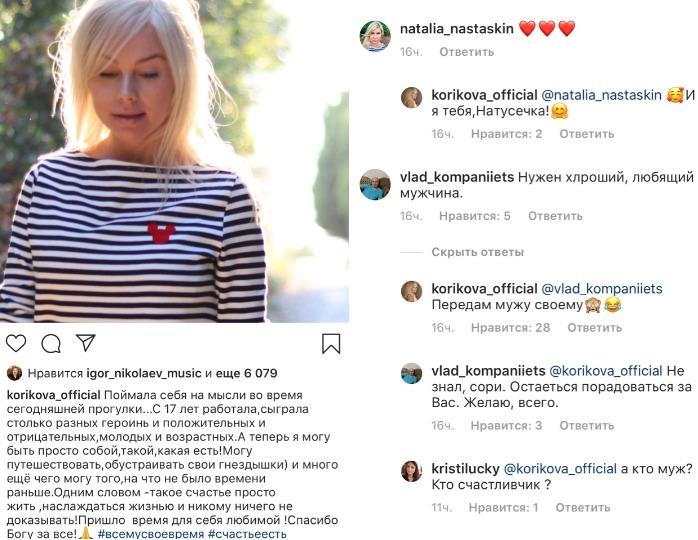 Своего избранника актриса тоже пока скрывает от публики. Елена Корикова обрела женское счастье. Фото: globallookpress.com Елена Корикова неожиданно призналась поклонникам, что вышла замуж. 47-летняя актриса опубликовала в Instagram откровенный пост, сообщила, что очень счастлива. Звезда сериала «Бедная Настя» рассказала, что начала сниматься с 17 лет, играя разнохарактерных героинь, но только сейчас нашла время, чтобы быть собой. Актриса поведала, что теперь намерена много путешествовать, заниматься обустройством дома и ничего никому не доказывать. Елена Корикова рассказала о муже. Фото: instagram.com/korikova_official/ В ответ на сообщение подписчики пожелали актрисе встретить любящего мужчину. «Передам своему мужу», – ответила звезда фолловеру. Также поклонники заметили, что на правой руке Кориковой появилось обручальное кольцо. Актриса вышла замуж в тайне и пока не желает выносить свою личную жизнь и на всеобщее обсуждение и рассказывать о своем избраннике. Елена Корикова впервые рассказала о мести бывшего возлюбленного Андрей Малахов напомнил актрисе в комментариях, что по-прежнему надеется на интервью с ней. Напомним, Елена Корикова была замужем дважды. Первый раз актриса узаконила отношения с писателем Дмитрием Липскеровым, от которого Корикова родила сына Арсения. Во второй раз актриса вышла замуж за режиссера Максима Осадчего. В 2011-2013 годах встречалась с актером Сергеем Астаховым.
