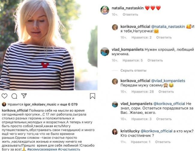 Елена Корикова неожиданно призналась поклонникам, что вышла замуж. 47-летняя актриса опубликовала в Instagram откровенный пост, сообщила, что очень счастлива. Звезда сериала «Бедная Настя» рассказала, что начала сниматься с 17 лет, играя разнохарактерных героинь, но только сейчас нашла время, чтобы быть собой. Актриса поведала, что теперь намерена много путешествовать, заниматься обустройством дома и ничего никому не доказывать.