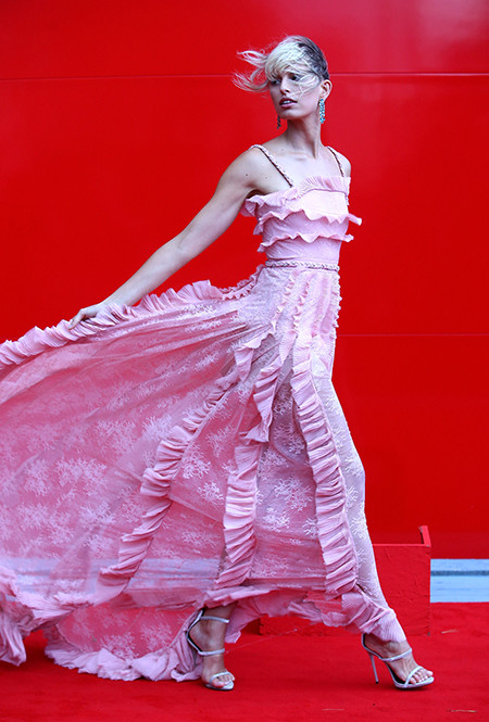 Компанию Изабели составила 33-летняя модель Каролина Куркова. Розовое платье в трендовых оборках, возможно, так и осталось бы одним из милых нарядов, если бы не все тот же ветер. Погода в данном случае стала прекрасным дополнением к романтичному образу высокого эльфа или нимфы.