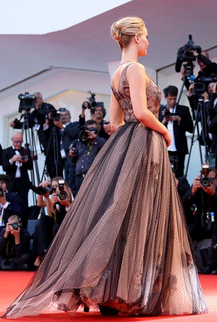Одна из самых высокооплачиваемых звезд Голливуда основные свои гонорары получает благодаря взаимовыгодной дружбе с модными домами. Не удивительно, что актриса прибыла на красную ковровую дорожку Венецианского кинофестиваля в платье Christian Dior из весенне-летней кутюрной коллекции этого года. К слову, на Дженнифер этот наряд смотрится совершенно иначе (более эффектно), нежели на показе. То ли за счет более пышных форм, то ли за счет большего количество нижних юбок.