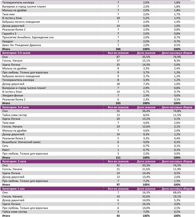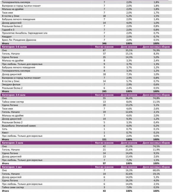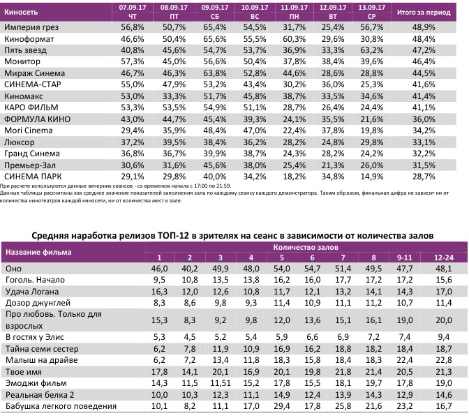 Лучший результат на фильме «Оно» показала киносеть «Империя грез», при этом сразу 8 сетей преодолели среднюю заполняемость в 40%.