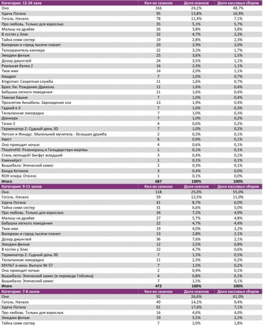 За первую неделю проката фильм «Оно» привлек в кинотеатры больше двух миллионов зрителей. Сборы превысили 535 млн рублей, что является рекордным показателем для жанра хоррор. Меньше 60% и 30% зрительской аудитории потеряли «Гоголь. Начало» и «Про любовь. Только для взрослых» соответственно, увеличив общий бокс-офис до 367 млн и 90 млн.