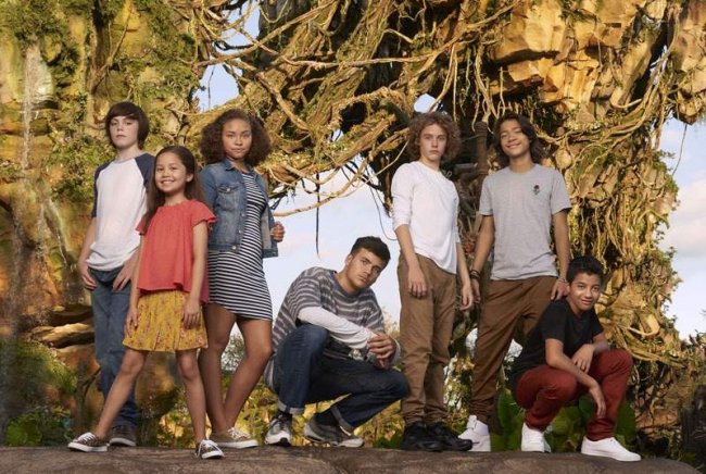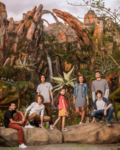 На фото (слева направо) присутствуют: Дуэйн Эванс-младший (Ротксо из клана Меткаина), Британ Далтон (Ло’ак из семьи Салли), Филип Гелджо (Аонунг из клана Меткаина), Тринити Блисс (Туктири из семьи Салли), Бейли Басс (Цирея из клана Меткаина), Джек Чемпион (Хавьер "Паук" Сокорро) и Джейми Флэттерс, который стоит (Нетеям из семьи Салли).