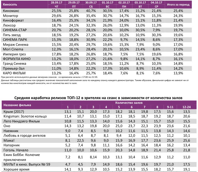 Как показывает индустриальная статистика с 28 сентября по 4 октября 2017 года (неделя №39), неделя на стыке сентября и октября оказалась слабее двух предыдущих. Почти треть проданных билетов пришлась на долю российской новинки «Крым». За первую неделю проката картину посмотрело свыше 800 тыс. зрителей, обеспечивших фильму без малого 200 млн. рублей. Вторая российская новинка «Любовь в городе ангелов» заработала 22 млн. рублей, стартовав с шестой позиции.