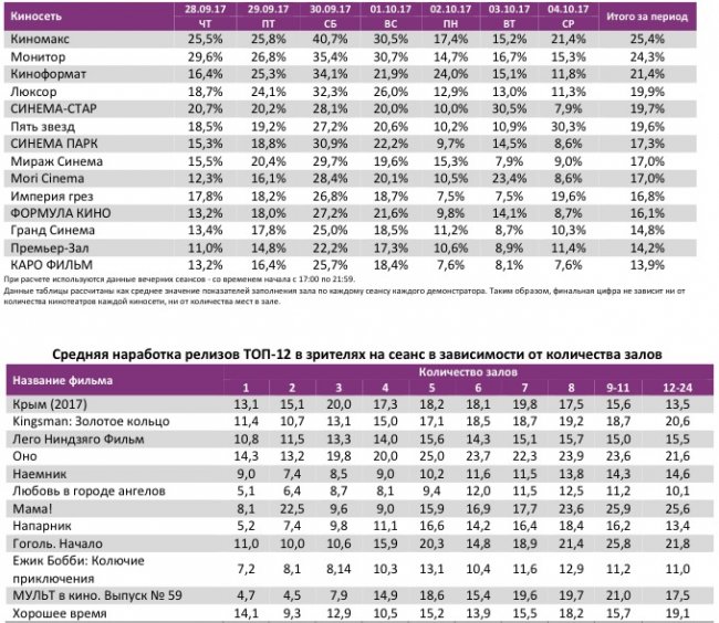 По наработке на сеанс лидерами стали короткометражный альманах «Manhattan Short 2017» и якутский фильм «Его дочь». В топ-12 по-прежнему «Гоголь. Начало» и «Про любовь. Только для взрослых».