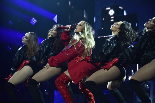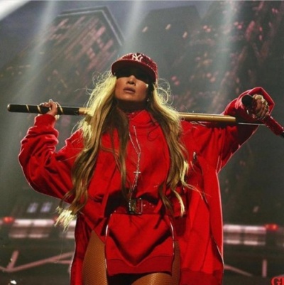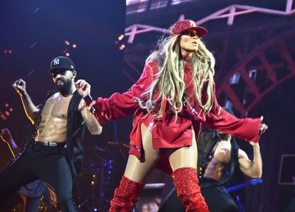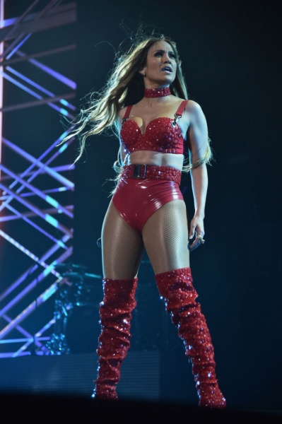 На сцену Лопес вышла в ботфортах со стразами, колготках в сетку и огромной толстовке, а после лихо скинула ее.
