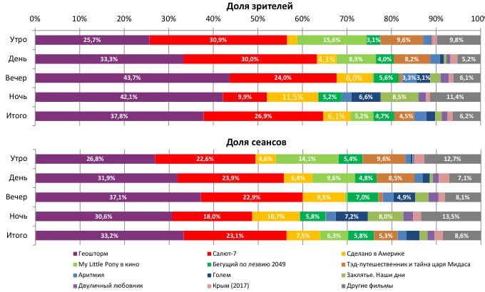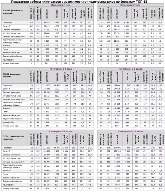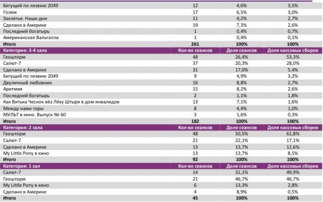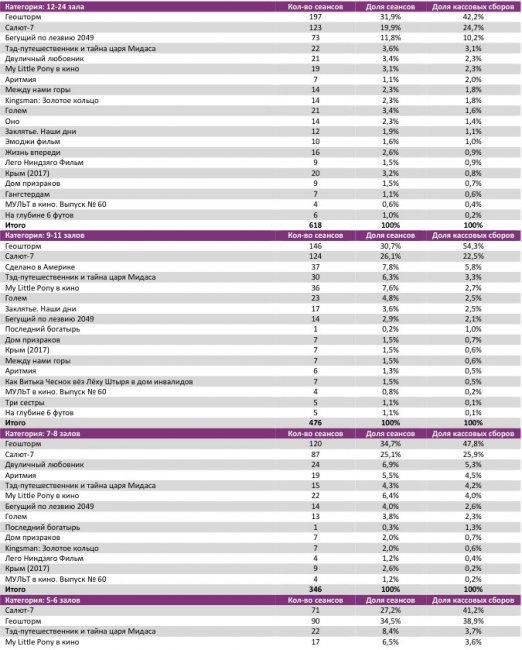 Репертуарное планирование кинотеатров с наибольшей выручкой за период «Геошторм» показывал долю сборов в лучших кинотеатрах от 39 до 62%. В лучшем однозальнике страны, а также в кинотеатре с 5-6 залами, лидерство сохранил «Салют-7».