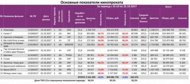 Как показывает индустриальная статистика с 19 по 25 октября 2017 года (неделя №42), четвертую неделю подряд российский прокат демонстрирует рост, хоть и минимальный. Лучше своей росписи выступают два российских фильма «Салют-7» и «Аритмия».