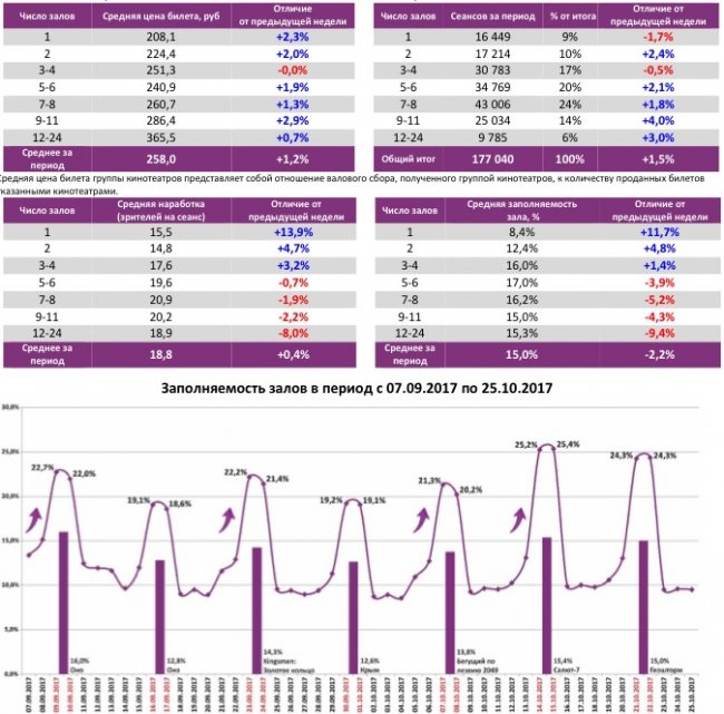 В отчётном периоде средняя цена билета составила 258 рублей. Максимальная наработка на сеанс была в кинотеатрах с 7-8 залами, а заполняемость - в кинотеатрах с 5-6 залами.