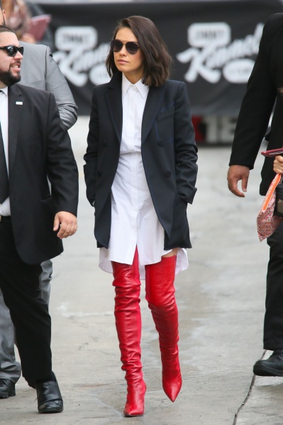 На шоу Джимми Киммела 34-летняя Мила появилась в непривычном для себя образе: она выбрала красные лаковые ботфорты от Fendi, белое платье-рубашку и черный жакет в стиле oversize.