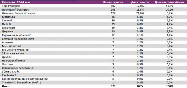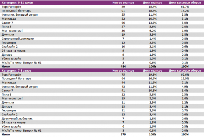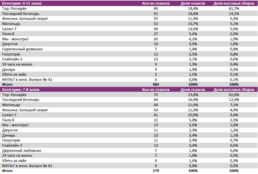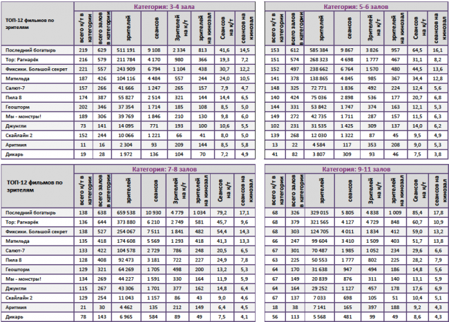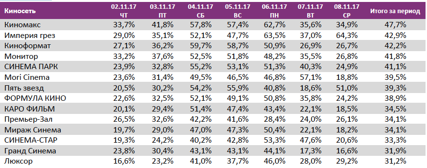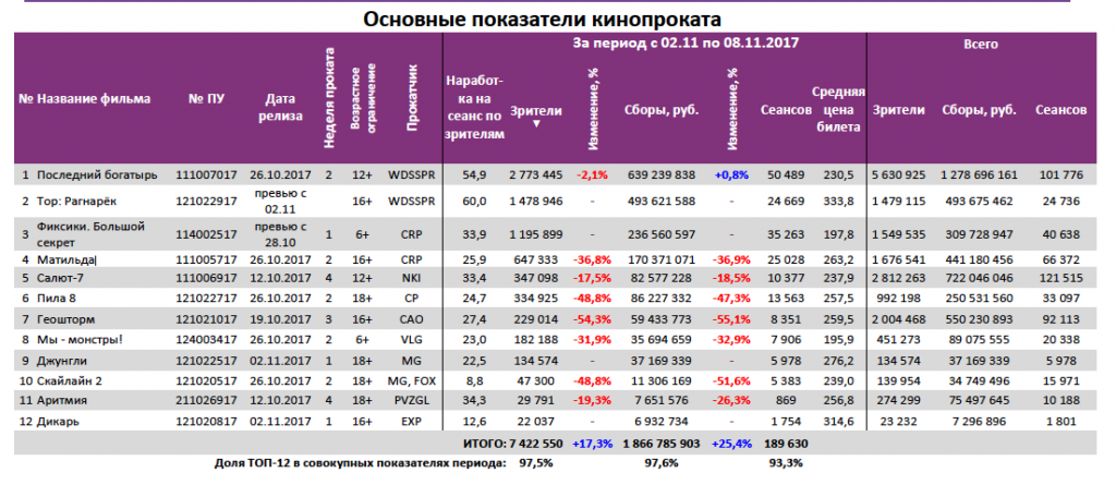 Лидером по наработке на сеанс стал «Тор:Рагнарек» (превью-показы со 2 ноября), опередивший «Последнего богатыря» (60 против 55 зрителей).
