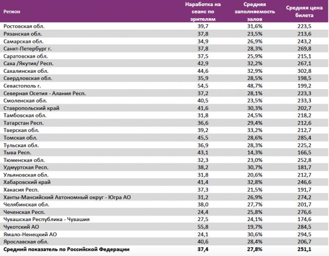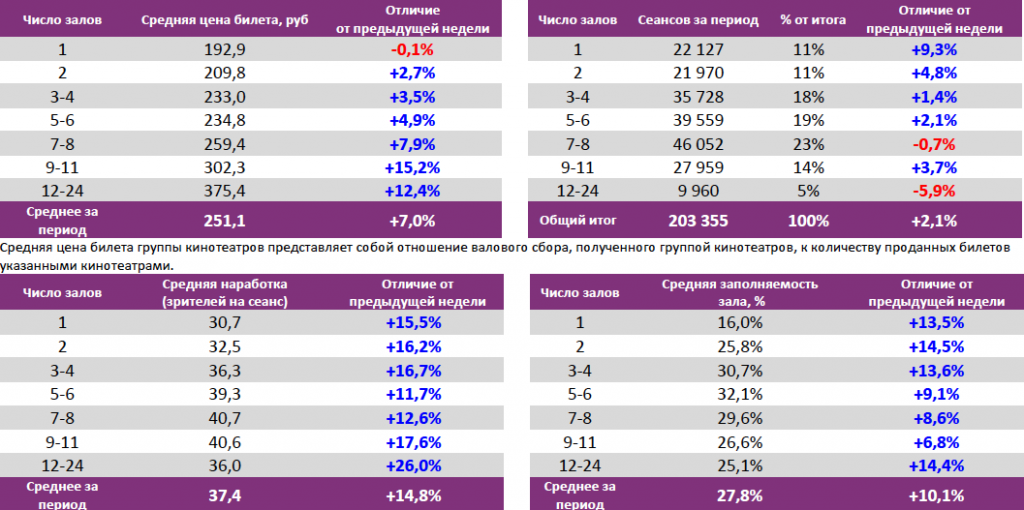 В отчётном периоде средняя цена билета составила 251 рубль. Средняя наработка на сеанс и заполняемость залов возросли до 37 зрителей и 28% соответственно.