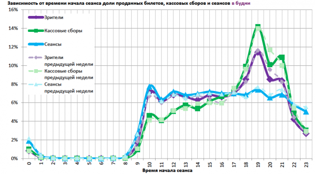 На графике указано распределение доли зрителей, сеансов и кассовых сборов по времени начала сеанса.
