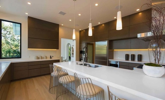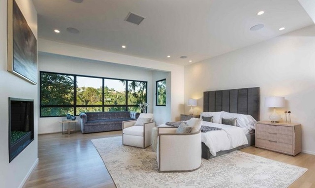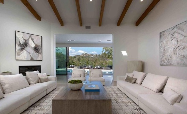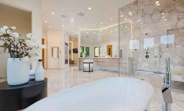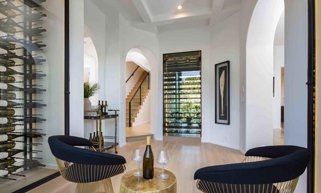 Помимо перечисленных помещений, интерьер которых выполнен в нейтральной цветовой гамме, в доме есть СПА, рабочий кабинет, винный погреб и теннисный корт.