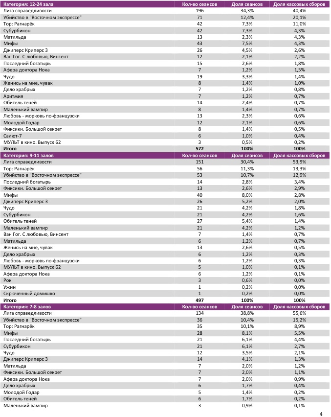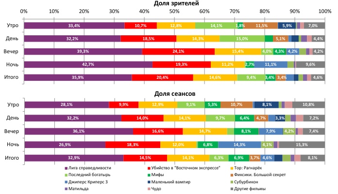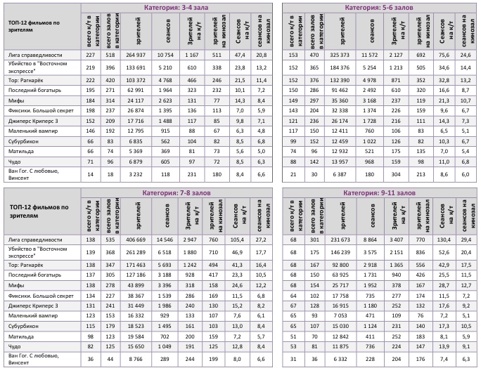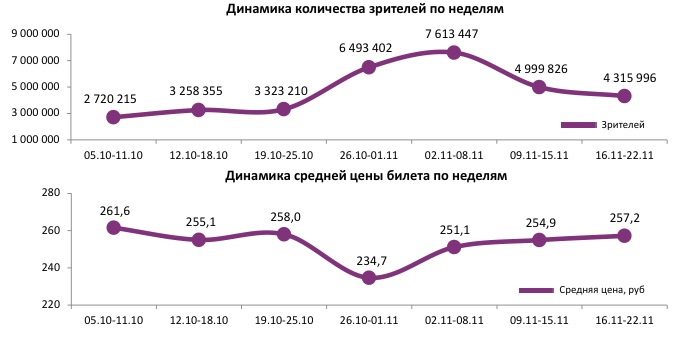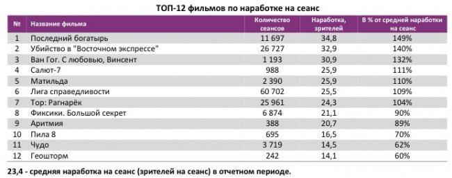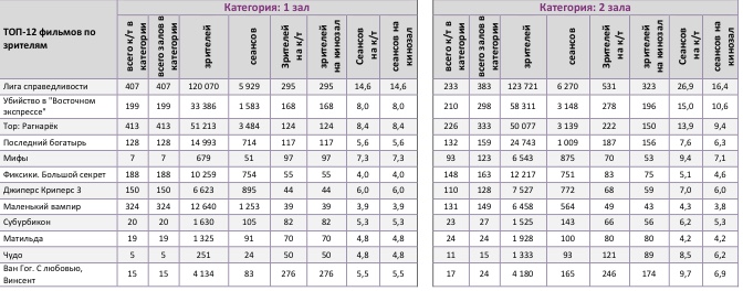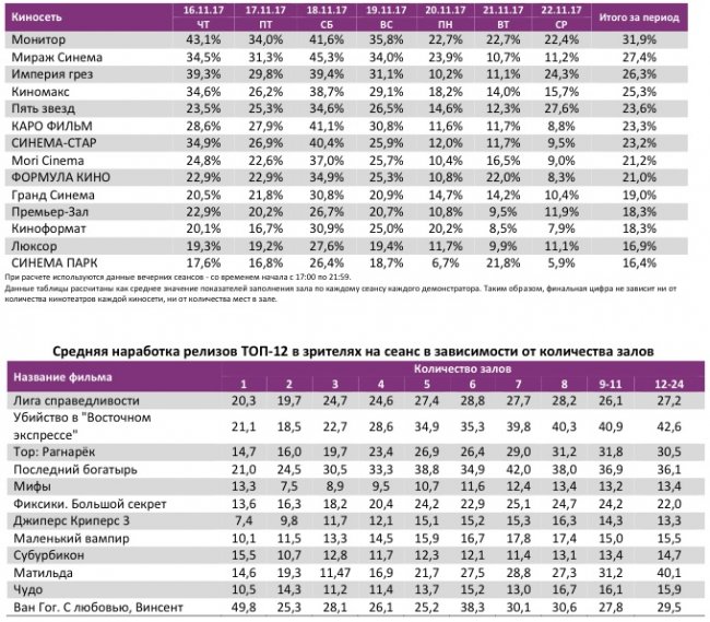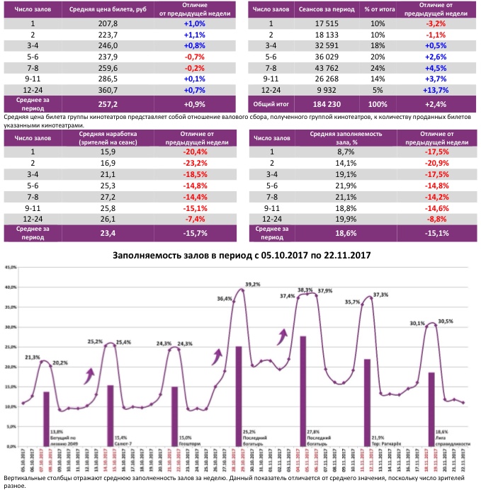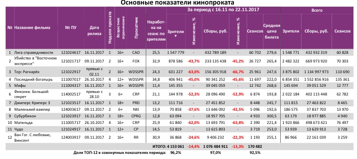 Как показывает индустриальная статистика с 16 по 22 ноября 2017 года (неделя №46), третью неделю ноября российские кинотеатры посетило свыше 4 млн. человек, оставивших в кассах больше миллиарда рублей. «Лигу справедливости» за первые семь дней проката посмотрело 1,5 млн. зрителей. На фильм «Тор: Рагнарек» приходится 3,9 млн. проданных билетов после двух недель, на «Последний богатырь» - 6,9 млн. Среди двенадцати релизов с лучшей наработкой на сеанс - пять российского производства.