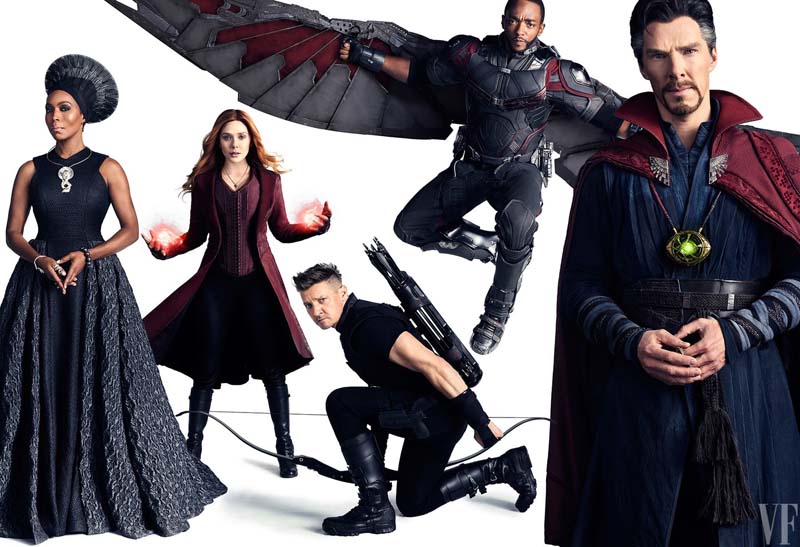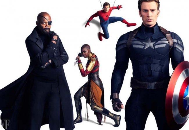 Команда героев из «Чёрной Пантеры», «Мстителей: Война бесконечности» и второй части «Человека-муравья» на специальной фотосессии от Vanity Fair, посвященной грядущему юбилею киновселенной Марвел.