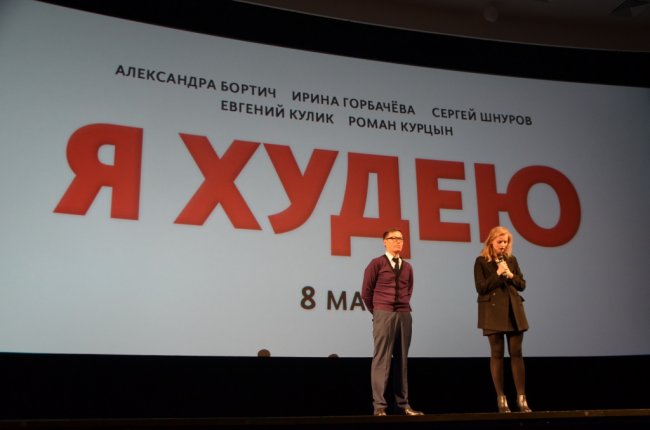 Тем не менее букеры увидели два новых отрывка, в которых во всей красе предстала набравшая для съёмок вес Александра Бортич. Уже похудевшая актриса, а также автор сценария Николай Куликов поднялись на сцену, чтобы представить фильм. Бортич произнесла долгую и проникновенную речь о том, что картина, несмотря на то, что это комедия, рассказывает о важной проблеме. В глобальном смысле «Я худею», по ее словам, не только о любви к себе, но и о людях, которые напрасно слишком много волнуются по поводу мнения окружающих. Сама актриса не обращает внимания на молву, но призналась, что склонна к полноте, и в 15 лет ее вес был примерно, как у героини фильма, что мешало девочке. Кстати, и режиссер Алексей Нужный, и сценарист Николай Куликов тоже прошли через серьезное похудение — не трудно понять, что создатели вовсе не издеваются над толстушками в их работе. Взяв слово, Куликов, который работал над сценариями одних из самых коммерчески успешных фильмов «Легенда №17», «Горько!» и «Экипаж», а также нового «Движение вверх», намекнул кинотеатрам: «Если Куликов поработает над фильмом, в котором есть спорт и комедия, то…».