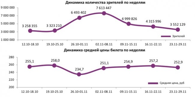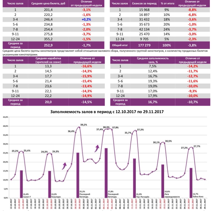 Как показывает индустриальная статистика с 23 по 29 ноября 2017 года (неделя №47), после максимальных результатов 2-8 ноября (7,6 млн зрителей) российский прокат продолжает демонстрировать падение посещаемости четвертую неделю подряд – до 3,6 млн в прошедший период. Минимальное падение в топ-12 продемонстрировал «Последний богатырь» (56%), увеличивший бокс-офис до 1,6 млрд рублей и ставший самым кассовым российским фильмом в истории. Рубеж в 400 млн рублей преодолела анимация «Фиксики».