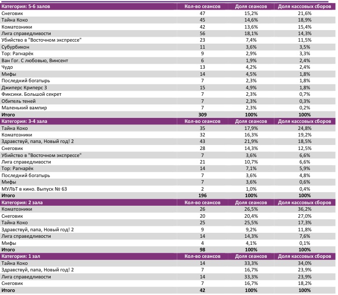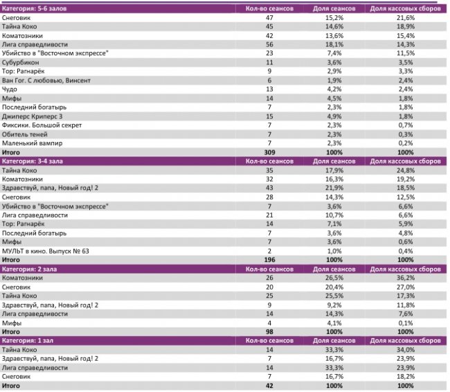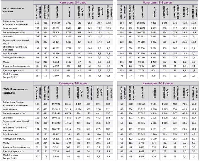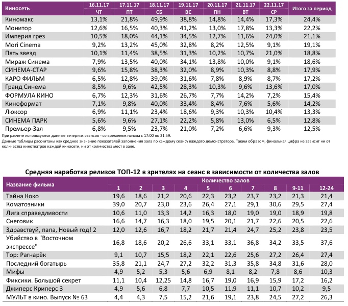 В семи лучших кинотеатрах страны лидерами стали разные фильмы – «Тайна Коко» (3 кинотеатра), «Коматозники» (2) и «Снеговик» (2).