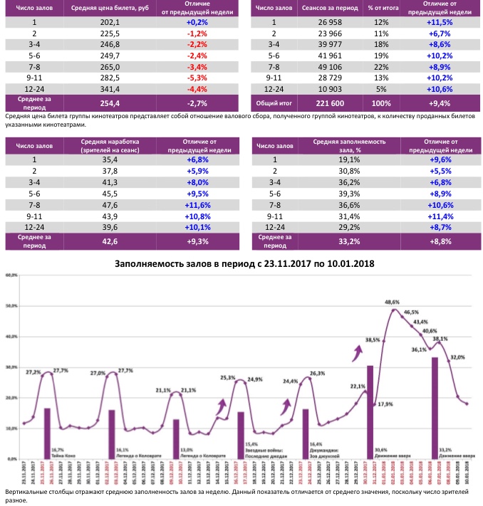 Средняя заполняемость залов снижалась с 49% 2 января до 32% 8 января.