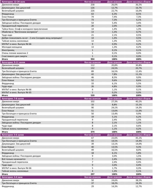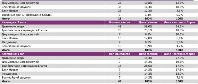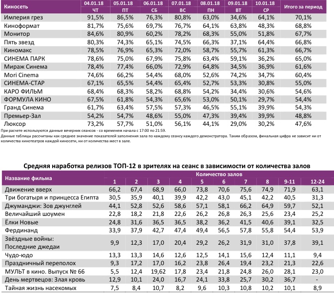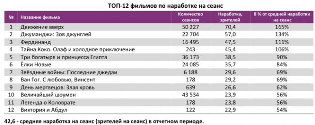 По наработке на сеанс «Джуманджи» уступил лидерство «Движению вверх» - 70 против 57 зрителей на показ.