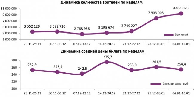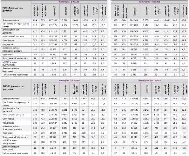 «Движение вверх» посмотрело уже свыше 5,5 млн зрителей, «Трех богатырей» - 3 млн. «Джуманджи» преодолел отметку в 4 млн проданных билетов. А «Ёлки новые» обошли по сборам и посещаемости предыдущую часть.