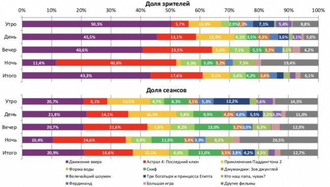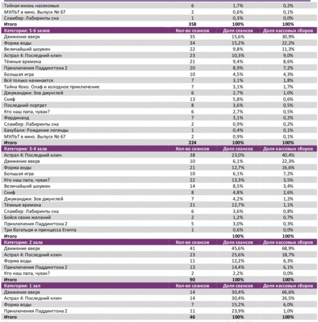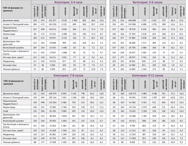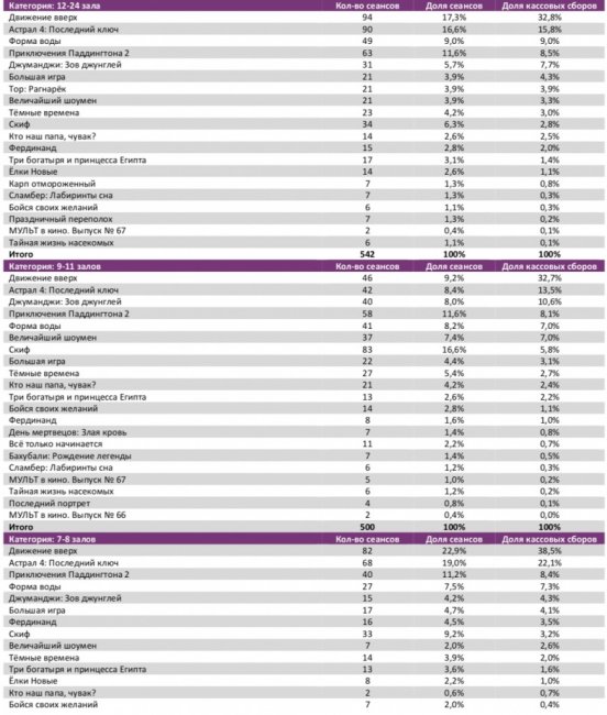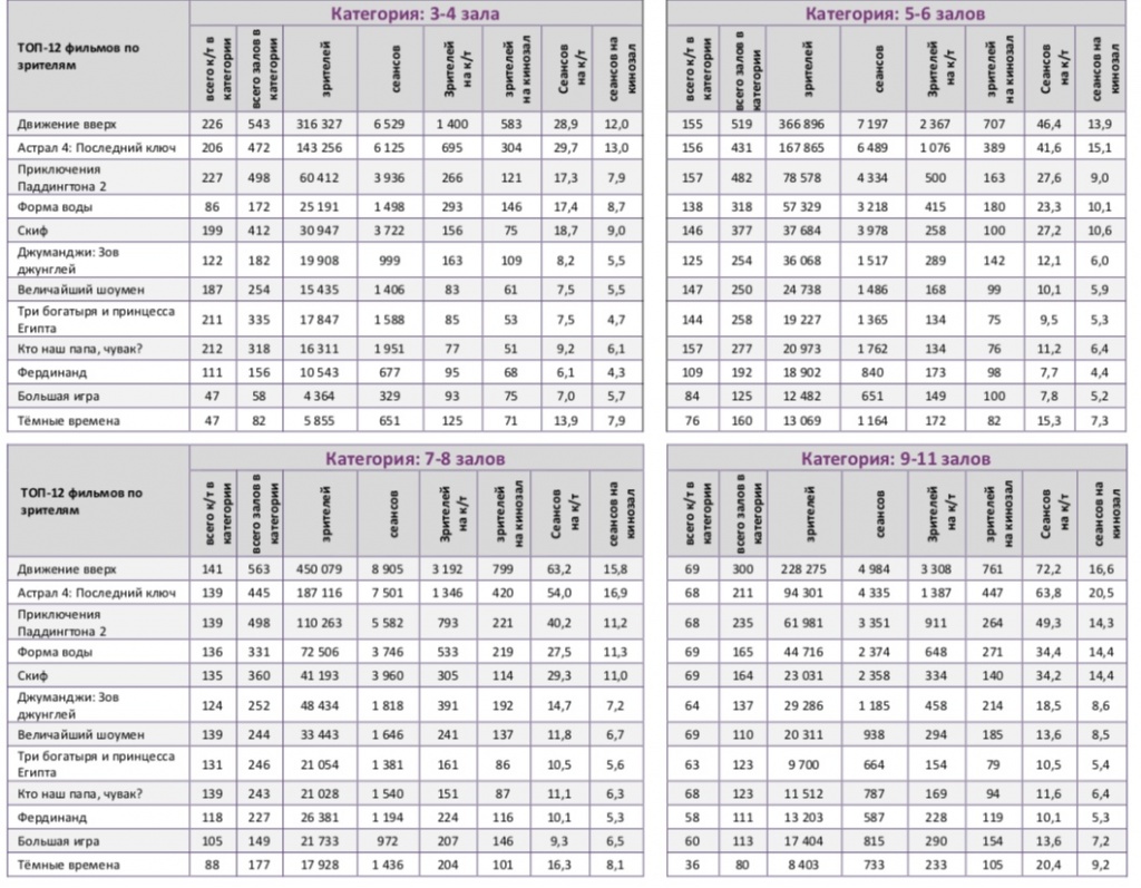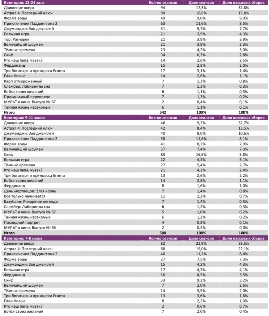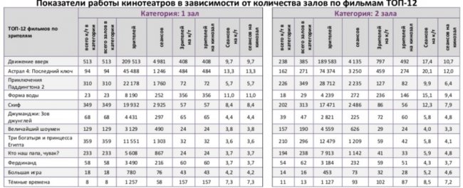 Среди семи лучших кинотеатров страны с разным количеством залов, «Движение вверх» не сохранило лидерство только в кинотеатре с 3-4 залами.