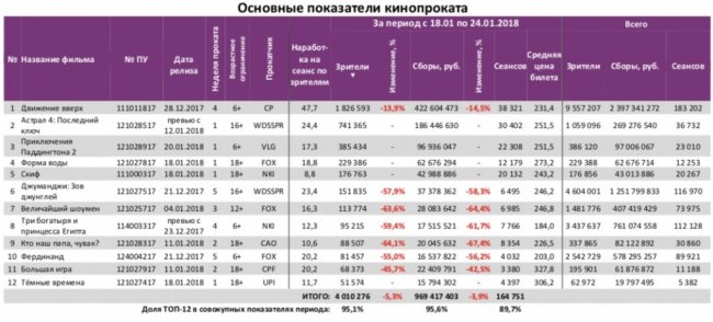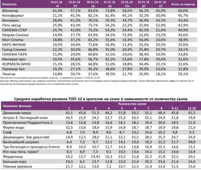Как показывает индустриальная статистика с 18 по 24 января 2017 года (неделя №3), лидером по посещаемости четвертую неделю подряд остаётся «Движение вверх» (на ленту приходится почти половина проданных билетов). К настоящему моменту картину посмотрело в российских кинотеатрах уже свыше 9,5 млн зрителей (2,4 млрд. рублей). Российская новинка «Скиф» стартовала с 43 млн рублей за первые семь дней проката. По наработке на сеанс стоит отметить высокие показатели фильма Рустама Хамдамова «Мешок без дна». Средняя цена билета в российских кинотеатрах составила 241 рубль. Заполняемость залов оказалась близкой к показателям прошлой недели. Репертуарное планирование кинотеатров с наибольшей выручкой за период Среди семи лучших кинотеатров страны с разным количеством залов, «Движение вверх» не сохранило лидерство только в кинотеатре с 3-4 залами. «Скиф» был расписан в 349 однозальных кинотеатрах. Заполняемость кинозалов крупнейших киносетей на сеансах фильма-лидера недели Фильм-лидер недели: «Движение вверх». Лидером по заполняемости на «Движении вверх» по-прежнему остаётся киносеть «Монитор». Статистика Фонда кино отражает информацию об основных результатах проката, лидерах недели по сборам и наработке на сеанс, показателях работы кинотеатров, эффективности репертуарного планирования, а также о соотношении долей по сборам, зрителям и сеансам в рамках данного периода.