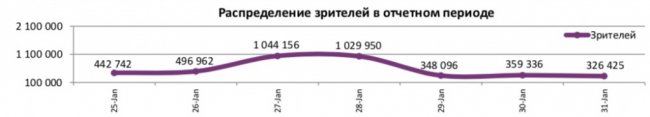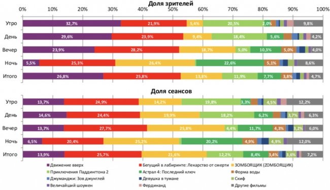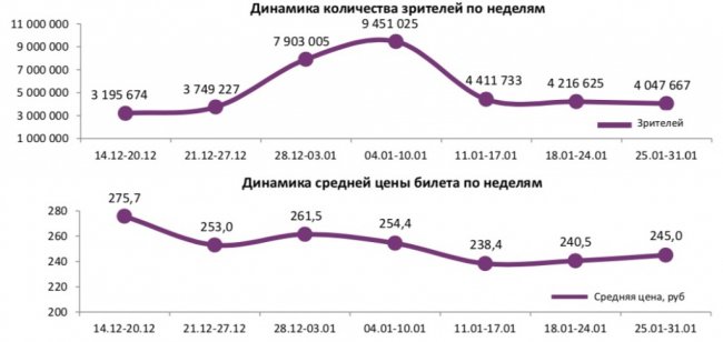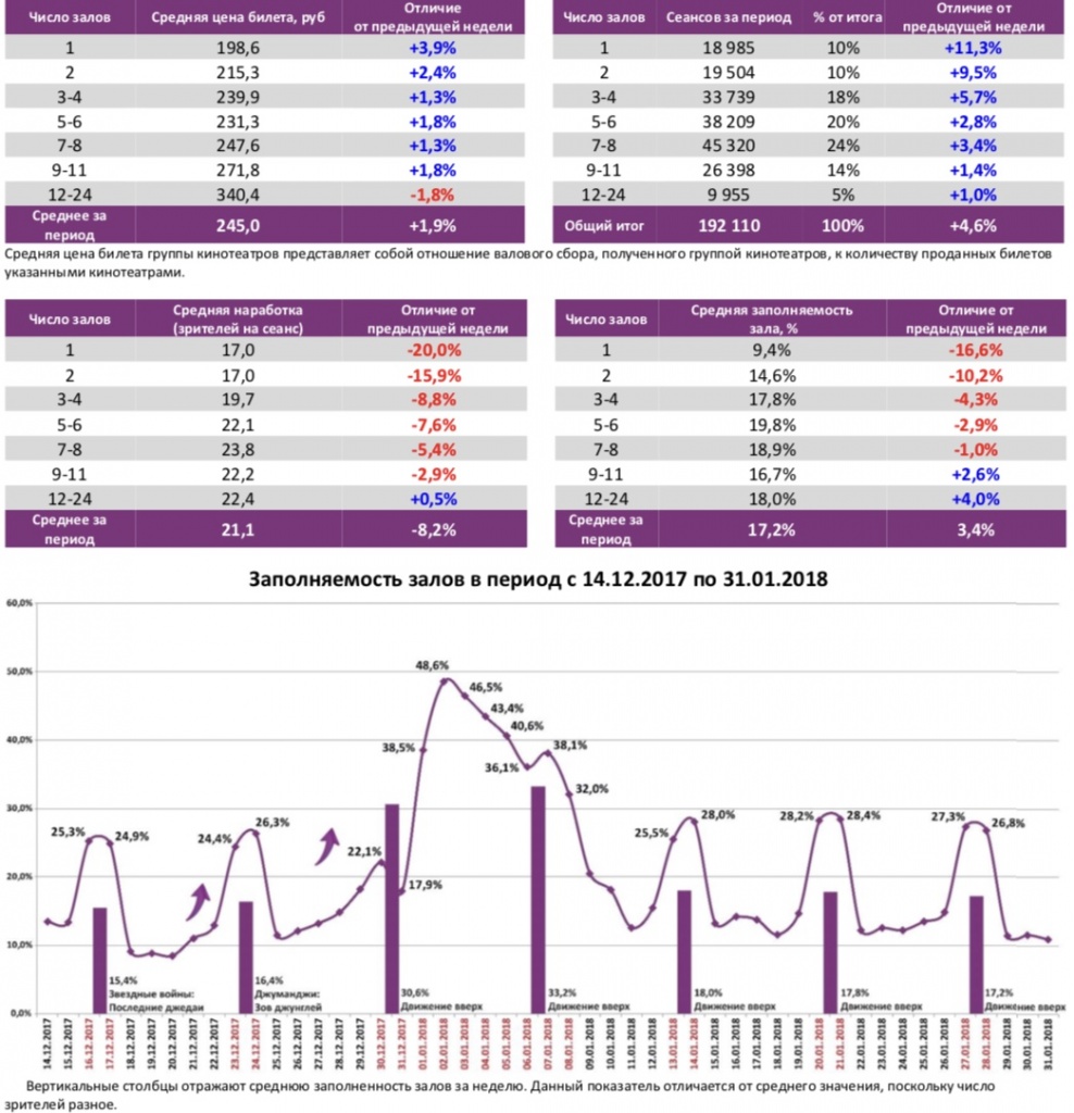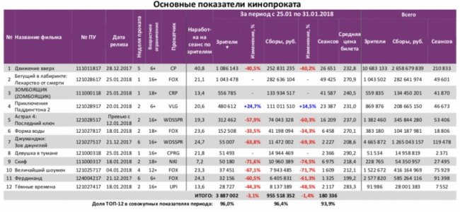 Как показывает индустриальная статистика с 25 по 31 января 2018 года (неделя №4), после окончания праздников посещаемость кинотеатров держится на уровне 4-4,4 млн проданных билетов в неделю. Лидерство по посещаемости сохраняет «Движение вверх» - в его активе каждый четвертый проданный билет. Картину посмотрело в российских кинотеатрах уже свыше 10,7 млн. зрителей (2,66 млрд. рублей). Другая российская новинка комедия «Zомбоящик» стартовала со 134 млн. рублей за первые семь дней проката. У «Скифа» после двух недель 54 млн.